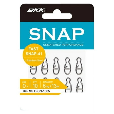 BKK Fast Snap-41 Stainless Steel Quick Snaps #4 (8 Pack) #4 (8 Pack) BKK Fast Snap-41 Stainless Steel Quick Snaps provide a reliable connection with the added convenience of not having to open the clip. Simply thread the exposed end of snap s wire through the line tie of the lure and down into the bend for a secure connection that no fish can undo. The high quality stainless steel construction provides superior strength under heavy loads and maximum corrosion resistance for long term reliability.